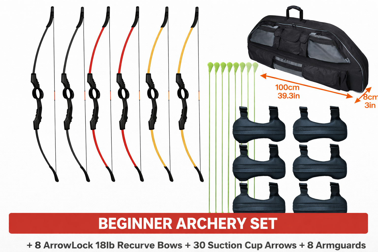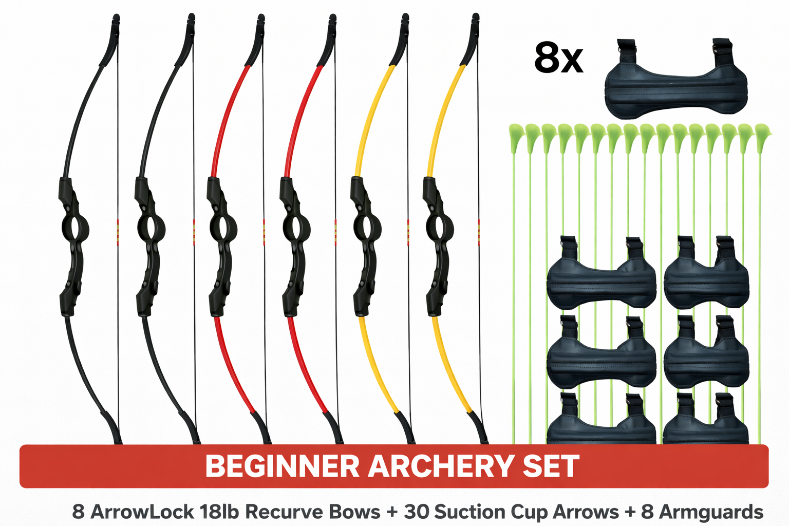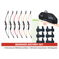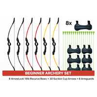 This complete beginner-friendly archery package includes 8 ArrowLock 18lb Take-Down Recurve Bows and 30 matching suction cup arrows, making it ideal for schools, clubs, holiday programs, community events, and come-and-try sessions.
